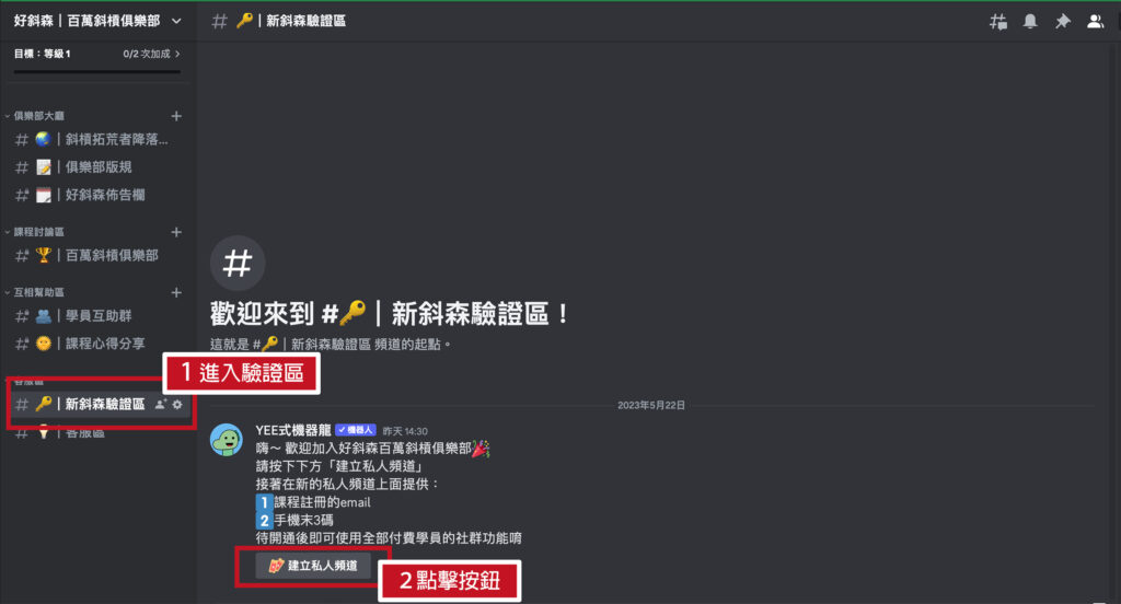 加入學員專屬Discord社群教學 嗨~歡迎大家加入百萬斜槓俱樂部,開始屬於自己的斜槓事業旅程以下是加入Discord的流程,若有任何問題也可以使用官方LINE@詢問 第一步:點擊信件中的連結入群 好斜森百萬斜槓俱樂部會員驗證入口點擊後會看到以下畫面,依照步驟操作即可 進入私人驗證頻道輸入購課的Email & 手機末3碼 提交完資料後,等待驗證完後就會開通會員專屬社群功能 第二步:閱讀板規,加入專屬討論群 在收到我們的驗證訊息後,可以到左邊面板找到「好斜森版規」 恭喜你完成~可以盡情探索了 有問題歡迎使用客服區客服區是一對一發問